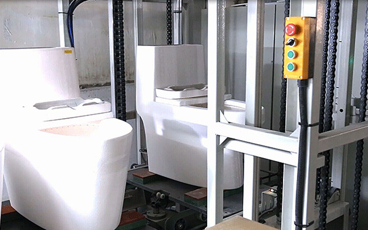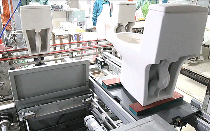 馬桶整廠自動化生產線是由坯體自動輸送干燥存儲、機器人打磨修坯、機器人噴釉、組裝、測試、成品包裝等階段組成,此自動化生產線提高了工作環境性與潔凈度,降低員工的工作疲勞度,為員工從簡單勞動向智力勞動的轉移,終實現馬桶整廠自動化生產。