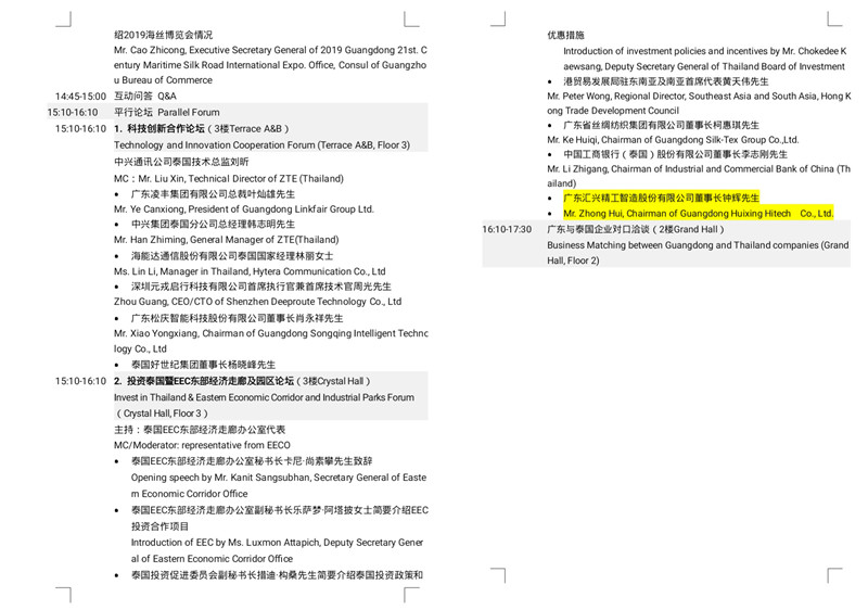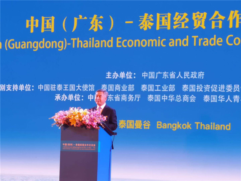 交流會上進行粵港澳大灣區與泰國合作發展研討暨廣東省企業未來發展計劃介紹,廣東省商務廳副廳長陳越華先生作主持。廣東省發展與改革委員會主任、推進粵港澳大灣區建設領導小組辦公室主任葛長偉先生帶來《共享粵港澳大灣區發展新機遇、推動廣東與泰國合作發展》的主題分享,珠海格力電器股份有限公司董事長董明珠女士、科大訊飛科大訊飛股份有限公司高級副總裁杜蘭女士介紹企業未來在泰國合作發展及投資計劃。交流會還進行《粵港澳大灣區建設背景下粵港與泰國合作發展機遇》研討沙龍環節,與泰國政商界代表共同探討促進廣東和泰國雙方的交流與合作。