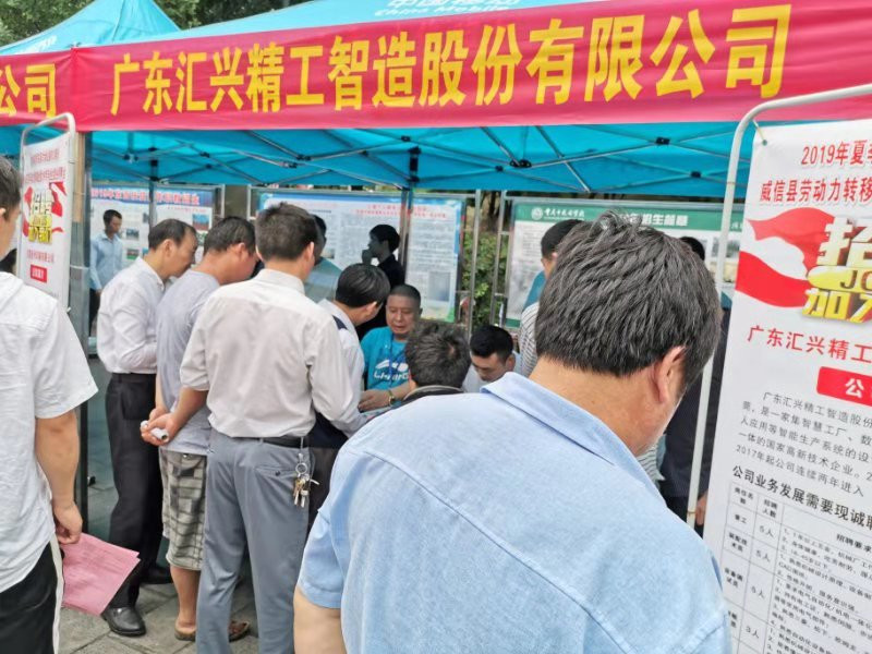 由威信縣委、縣政府,東莞市大嶺山鎮黨委、政府主辦,威信縣人社局、東莞市大嶺山鎮人社分局承辦的“2019年夏季東莞市大嶺山鎮對口幫扶威信縣農村勞動力轉移就業專場招聘會”在云南威信縣體育館廣場隆重舉行。此次招聘會有來自廣東省大嶺山鎮的名優企業10余家,大嶺山鎮提供就業崗位500余個。招聘會現場氣氛熱烈,其中匯興智造集團招聘位置前排成長長的隊伍,應聘者禮貌有序地排隊填寫應聘表。