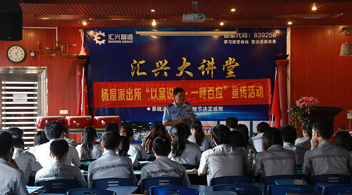 為進一步增強廣東匯興精工智造股份有限公司(股票代碼:839258)全體員工的自我保護意識,提高自我防范能力,預防和減少詐騙跟盜搶性案件的發生, 7月29日下午,匯興智造特邀楊屋派出所民警走進企業,為全體員工開展“防騙、防搶”安全知識講座。公司全體辦員工代表共計40人在匯興學校聆聽精彩的講座。